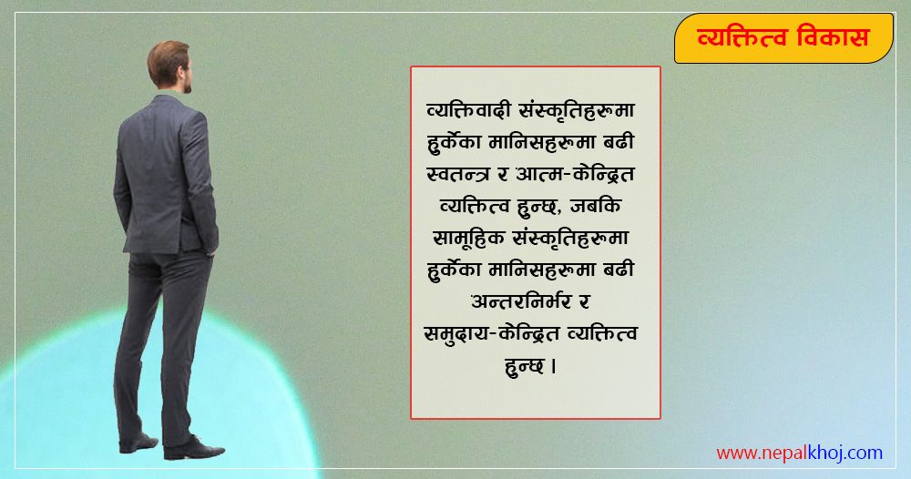 सांस्कृतिक पृष्ठभूमि : व्यक्तित्व विकासमा सांस्कृतिक पृष्ठभूमिले पनि महत्त्वपूर्ण भूमिका खेल्छ । एक व्यक्ति हुर्केको संस्कृतिले उनीहरूको मूल्यमान्यता, विश्वास र व्यवहारलाई प्रभाव पार्न सक्छ। उदाहरणका लागि, व्यक्तिवादी संस्कृतिहरूमा हुर्केका मानिसहरूमा बढी स्वतन्त्र र आत्म-केन्द्रित व्यक्तित्व हुन्छ, जबकि सामूहिक संस्कृतिहरूमा हुर्केका मानिसहरूमा बढी अन्तर निर्भर र समुदाय-केन्द्रित व्यक्तित्व हुन्छ।