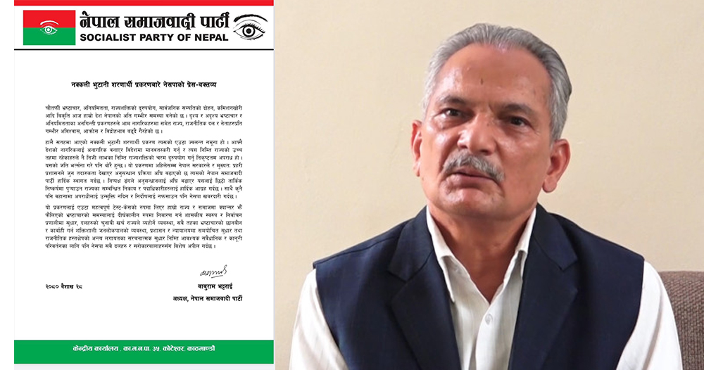 काठमाडौं । नेपाल समाजवादी पार्टीले नक्कली भुटानी शरणार्थी ठगी प्रकरणलाई राज्यशक्तिको चरम दुरूपयोग गर्नु निकृष्टतम अपराध भनेको छ ।