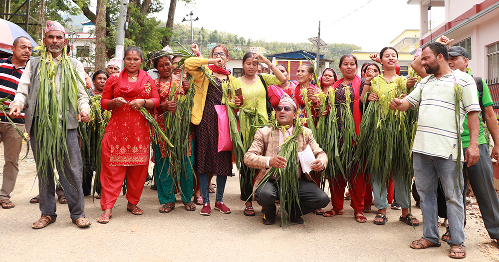 बाँदरले मकै नाश गरेको मकैको बोटकै माला लगाएर किसान सदरमुकाम धादिङवेशीमा रहेका सरकारी कार्यालयको गेट गेटमै नारा लगाउँदै हिँडेका हुन् ।