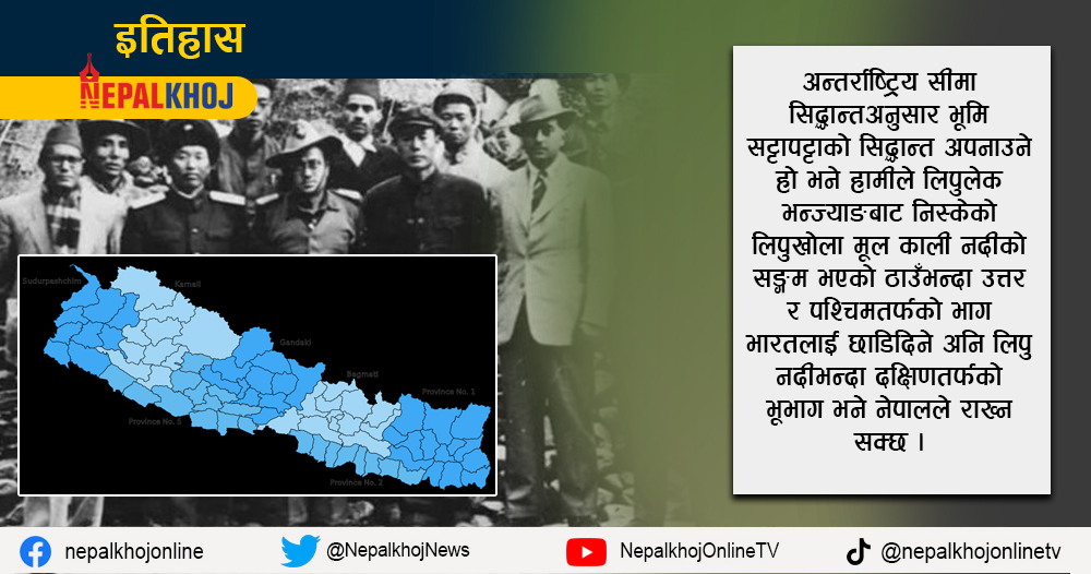 उनले भने, ‘अन्तर्राष्ट्रिय सीमा सिद्धान्तअनुसार भूमि सट्टापट्टाको सिद्धान्त अपनाउने हो भने हामीले लिपुलेक भन्ज्याङबाट निस्केको लिपुखोला…मूल काली नदीको सङ्गम भएको ठाउँभन्दा उत्तर र पश्चिमतर्फको भाग भारतलाई छाडिदिने अनि लिपु नदीभन्दा दक्षिणतर्फको भूभाग भने नेपालले राख्न सक्छ।’