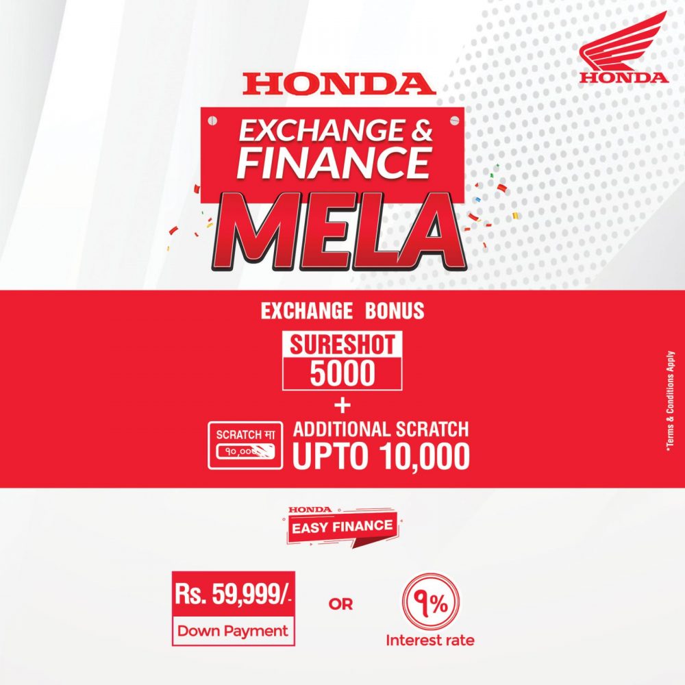 मेलामा, आफ्नो पुरानो बाइकसँग होण्डको कुनै पनि नयाँ बाइक साट्दा उच्च मूल्यांकन रकमका साथमा तुरुन्तै रु. ५००० मा एक्सचेन्ज बोनस पनि पाइनेछ । र साथमा रु. १० हजारसम्मको आकर्षक स्क्र्याच कुपनले पनि धेरै भन्दा धेरै ग्राहक लाभान्वित भइरहेका छन् । यस, होण्डा एक्सचेन्ज र फाईनान्स मेलामा, सस्तो अग्रिम भुक्तानी र निक्कै कम ब्याज दरमा नयाँ होण्डा खरिद पनि गर्न सकिन्छ ।