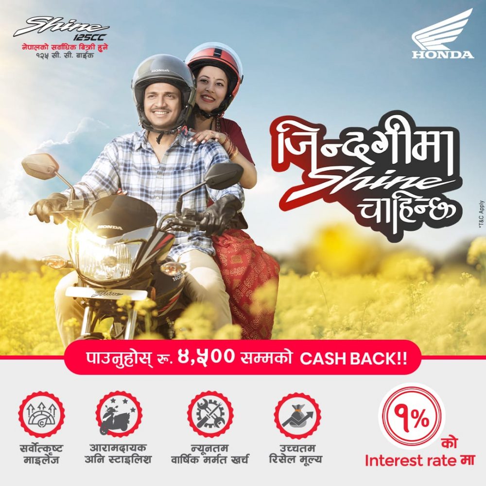 यो योजना जेठ १८ देखि असार १५ सम्म मात्र कायम रहने छ । आरामदायी र आकर्षक होण्डा साइनमा उपलब्ध यो अवसरले ग्राहकहरुलाई भरपुर फाइदा पुग्नेमा कम्पनी विश्वस्त छ ।