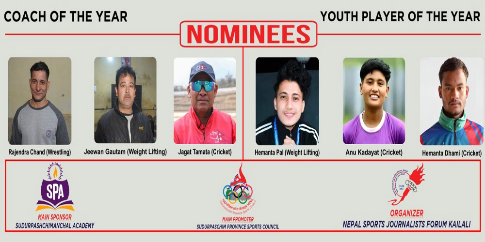 यसअघि चार विधाको मनोनय सार्वजनिक गरिसकिएको छ । वर्ष प्रशिक्षकमा क्रिकेटका जगत टमाटा, कुस्तीका राजेन्द्र चन्द र भारत्तोलनका जीवन गौतम मनोनयनमा परेका छन् । वर्ष युवा खेलाडीमा भारत्तोलनका हेमन्त पाल, क्रिकेटकी अनु कडायत र क्रिकेटकै हेमन्त धामी मनोनयनमा परेका छन् । सुदूरपश्चिम आइकन पुरुष विधामा फेस्निङ्गका जलेन्द्र शाही, करातेका आनन्द कामी र फुटबलका जियारत सेख मनोनयनमा पर्दा सुदूरपश्चिम आइकन महिला विधामा कुस्तीकी मनिषा सिंह, फुटबलकी दीपा रोकाया र क्रिकेटकी कविता कुँवर मनोनयनमा परेका छन् ।