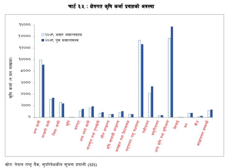 राष्ट्र बैंकका अनुसार २०७९ पुस मसान्तसम्म कृषि कर्जाका विभिन्न शीर्षकहरुमा प्रवाहित कर्जा मध्ये अन्य कृषि तथा कृषिजन्य सेवामा प्रवाहित कर्जाको अंश सबैभन्दा बढी २७ दशमलव एक प्रतिशत रहेको प्रतिवेदनमा उल्लेख छ ।