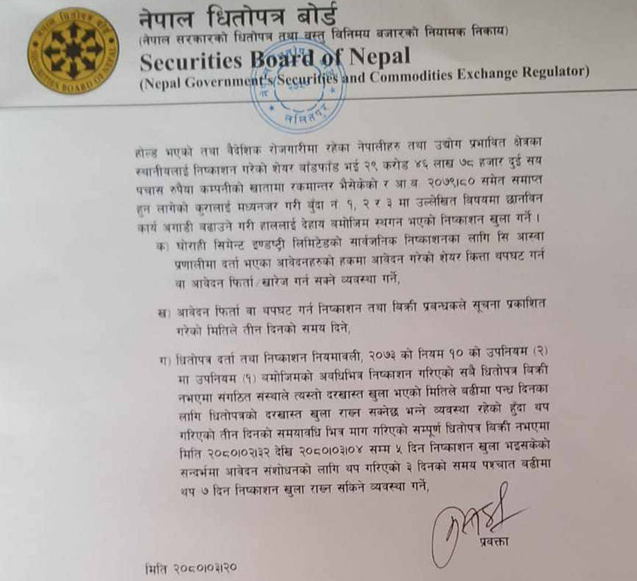 काठमाडाैं । नेपाल धितोपत्र बोर्डले घोराही सिमेन्ट इन्डष्ट्री लिमिटेडको सार्वजनिक निष्कासन सम्बन्धमा गरेको छानबिन प्रतिवेदनअनुसार चारवटा निर्णय गरेको छ ।