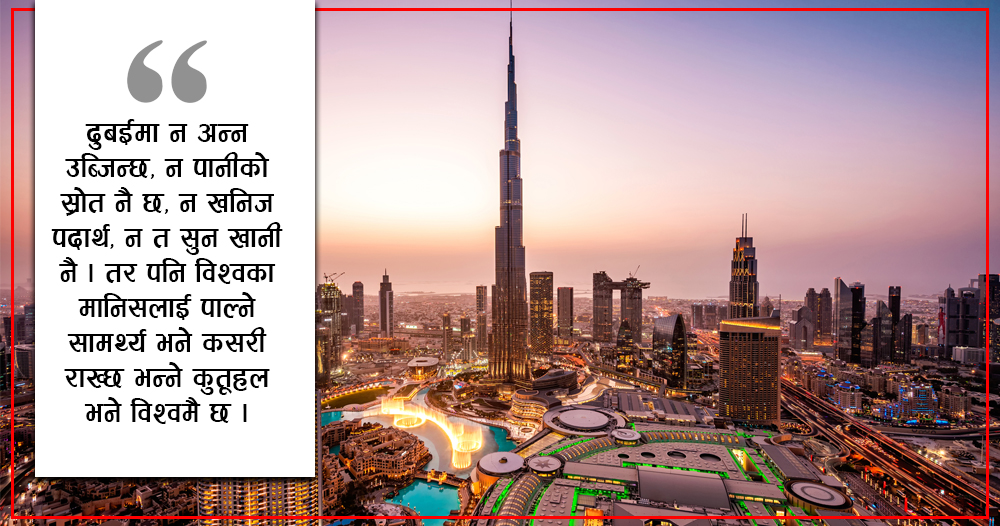 विभिन्न देशका युवाहरू ५० डिग्रीसम्म तापक्रम सहेर दुबईमा खुसीसाथ काम गरेर कमाइ गरिरहेका छन् । ५० डिग्री सेल्सियससम्मको तापक्रममा लाखौं श्रमिकलाई काम गर्ने वातावरण पनि दुबई सरकारले बनाएकै छ । नेपाल, भारत, पाकिस्तानलगायत विभिन्न देशका नेतृत्ववर्गले विकासको काम दिमागमा मात्रै लिने गर्छन् । कागजमा योजना बनाइहाले पनि कार्यान्वयनमा समस्या हुन्छ । तर दुबईको नेतृत्व यस्तो छ उसले विश्वका थिंक-ट्यांक तथा स्वस्थ मजदुरलाई अर्बौं रुपैयाँ खर्च गरेर काममा खटाउने गरेको छ । नेपाललगायत विकासोन्मुख देशहरू काम गरेपछिको परिणाम सोच्ने गर्छन् । तर दुबईको नेतृत्व काम सुरु गरेपछि वा सकिएपछि अझ दूरदर्शी किसिमले अर्को ढंगले विकासको काम अघि बढाइहाल्छन् । नेपालमा चिन्तनशील नेतृत्व मात्र छ, काम गरिहाल्ने प्रतिबद्ध नेतृत्व छैन । दुबईका शासकहरू बाह्य देशका श्रमिकलाई उनीको पनि गतिलो आर्थिक भविष्य हुनेगरी काम लगाउँछन् । दूरदर्शी योजना बनाउँछन् । काम हुँदै गर्दा अझ ठूलाठूला सपना बुन्ने गर्छन् र त्यो सपनालाईं व्यवहारमा उतार्न फेरि बाह्य देशका थिंक-ट्यांक बोलाएर लागु गराई छाड्छन् ।