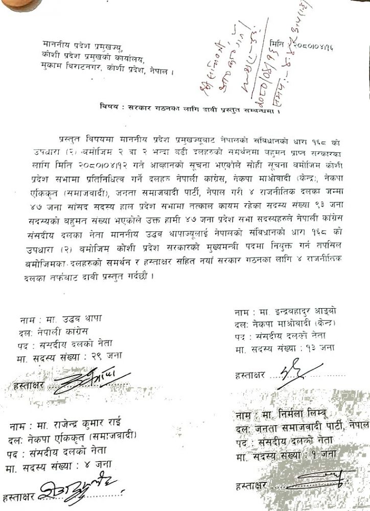 उनले आफूलाई कांग्रेस, माओवादी केन्द्र, एकीकृत समाजवादी र जनता समाजवादी पार्टीका गरी ४७ सांसदको समर्थन रहेको भन्दै मुख्यमन्त्रीमा नियुक्त गर्न माग गरेका छन् ।