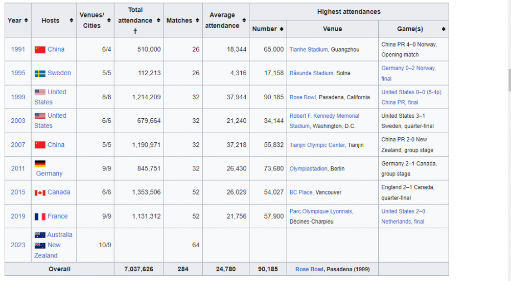 महिला विश्वकपको पहिलो संस्करण सन् १९९१ को नोभेम्बर १६ देखि ३० सम्म चीन, दोस्रो १९९५ जुन ५ देखि १८ सम्म स्विडेन, तेस्रो १९९९ जुन १९ देखि जुलाई १० सम्म अमेरिका, चौथो २००३ सेप्टेम्बर २० देखि अक्टोबर १२ सम्म अमेरिकामा भएको थियो । त्यस्तै, पाँचौँ संस्करण सन् २००७ सेप्टेम्बर १० देखि ३० सम्म चीन, छैटौँ २०११ जुन २६ देखि जुलाई १७ सम्म जर्मनी, सातौँ २०१५ जुन ६ देखि जुलाई ५ सम्म क्यानडा र आठौँ २०१९ जुन ७ देखि जुलाई ७ सम्म फ्रान्समा भएको थियो ।