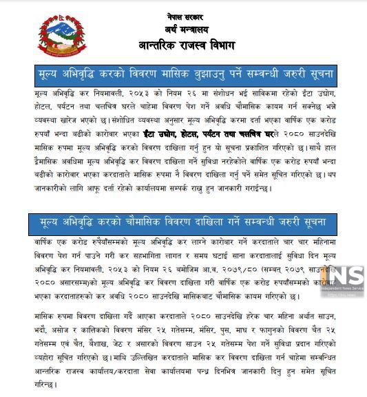 ‘मूल्य अभिवृद्धि कर नियमावली, २०५३ को नियम २६ मा संशोधन भई साविकमा रहेको इँटा उद्योग, होटल, पर्यटन तथा चलचित्र घरले चाहेमा विवरण पेस गर्ने अवधि चौमासिक कायम गर्न सक्नेछ भन्ने व्यवस्था खारेज भएको छ,’ विभागद्वारा जारी सूचनामा, ‘संशोधित व्यवस्थाअनुसार मूल्य अभिवृद्धि करमा दर्ता भएका वार्षिक १ करोड रुपैयाँभन्दा बढीको कारोबार भएका इँटा उद्योग, होटल, पर्यटन तथा चलचित्र घरले २०८० साउनदेखि मासिक रूपमा मूल्य अभिवृद्धि करको विवरण दाखिला गर्नुपर्नेछ ।’