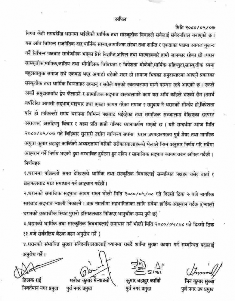 धरानमा पछिल्लो समय भइरहेको गतिविधिप्रति गम्भीर ध्यानाकर्षण भएको जनाउँदै धरानका पूर्वमेयरहरुको बैठकले धरानबासीमा चार बुँदे आह्वान गरेका छन् । धरान सांस्कृतिक रुपमा वर्षौंदेखि आपसी सद्भाव, भाइचारा तथा एकता कायम गरेको समाज भएको र यस किसिमको सामाजिक सदभाव धमिल्याउने गतिविधि पहिले कहिल्यै नभएको उल्लेख गर्दै पूर्वमेयरहरुको बैठकले धार्मिक तथा सांस्कृतिक विवादलाई सम्बन्धित पक्षहरु बसेर वार्ता तथा छलफलबाट समाधान गर्न आग्रह गरेको छ ।
