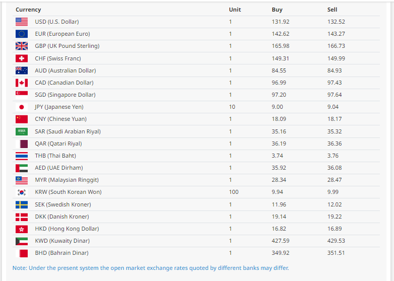 त्यस्तै, युरो एकको खरिददर १४२ रुपैयाँ ६२ पैसा र बिक्रीदर १४३ रुपैयाँ २७ पैसा रहेको बैंकले जनाएको छ । त्यस्तै, बेलायती पाउन्ड एकको खरिददर १६५ रुपैयाँ ९८ पैसा र बिक्रीदर १६६ रुपैयाँ ७३ पैसा रहेको छ भने, कतारी रियाल एकको खरिददर ३६ रुपैयाँ १९ पैसा र बिक्रीदर ३६ रुपैयाँ ३६ पैसा रहेको राष्ट्र बैंकले जनाएको छ ।