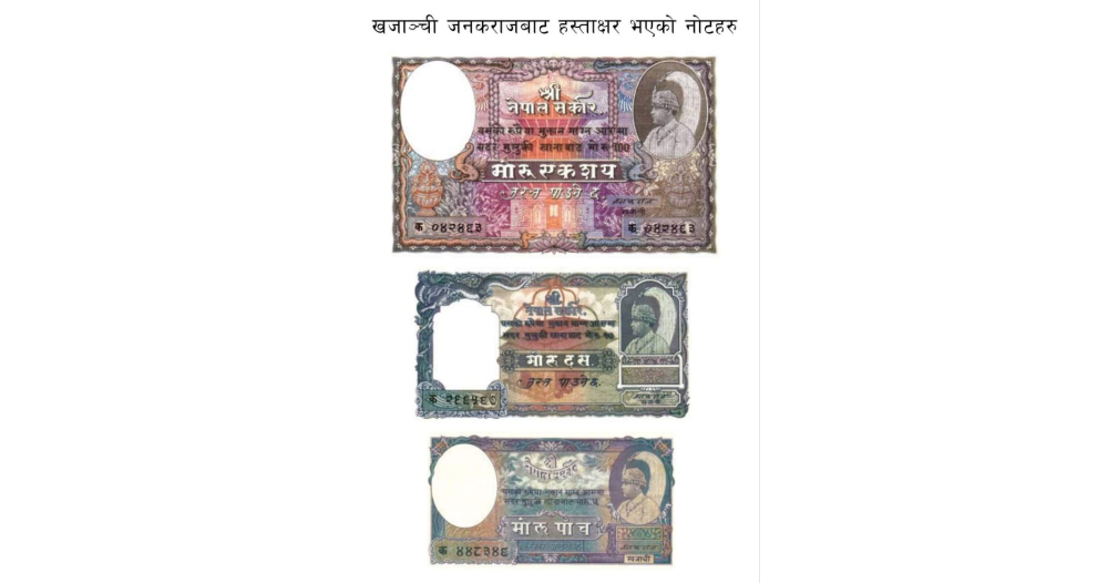 वि.सं. २००४ साल पछि खजाञ्जी भरतराजको हस्ताक्षरमा ५, १० र १०० का नोटहरु निस्काशित भएको थियो भने २००९ सालबाट नरेन्द्रराजको हस्ताक्षरमा रु १, ५, १० र १०० का नोटहरु निस्काशित भए । यि सबै नोटहरु भारतको नासिक स्थित India Security Press मा छापिएका थिए ।