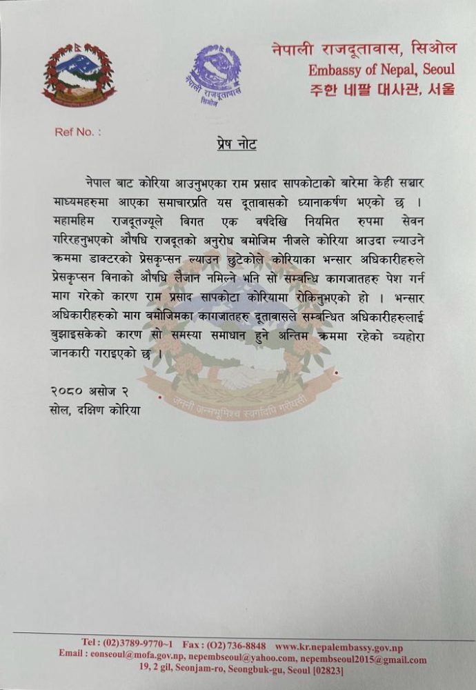 ‘अन्जानबस डाक्टरको प्रेस्क्रिप्सन मसँग नभएकाले कोरियन सरकारको भन्सारले आवश्यक डकुमेन्ट मागेकाले राजदूतावासले डकुमेन्ट बुझाइसकेको छ,’ यसबारे टीकाटिप्पणी हुन थालेपछि सामाजिक सञ्जालमा उहाँले लेख्नुभएको छ, ‘भन्सारको भेरिफिकेसन नसकिएसम्म मलाई कोरियाबाट नेपाल फर्कन नदिइएको सत्य हो।’