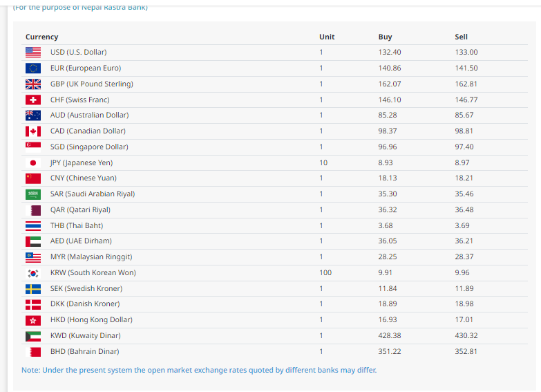 यस्तै, आज अमेरिकी डलरको खरिद दर १३२ रुपैयाँ ४० पैसा र बिक्री दर १३३ रुपैयाँ रहेको छ । युरो एकको खरिद दर १४० रुपैयाँ ८६ पैसा र बिक्री दर १४१ रुपैयाँ ५० पैसा रहेको छ ।