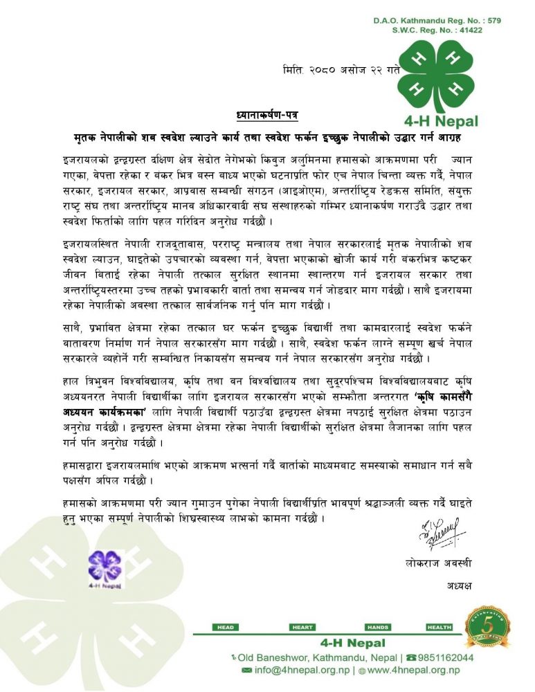 फोर एच नेपालका अध्यक्ष लोकराज अवस्थीद्वारा हस्ताक्षरित उक्त वक्तव्य भनिएकोछ, इजरायलको द्वन्द्वग्रस्त दक्षिण क्षेत्र सेदोत नेगेभको किवुज अलुमिनमा हमासको आक्रमणमा परी घाइते भएका, वेपत्ता रहेका तथा बंकर भित्र बस्न बाध्य भएकाहरु उद्धार कार्यका लागि नेपाल सरकार तथा इजरायल सरकारको ध्यानाकर्षण गराइएको छ ।