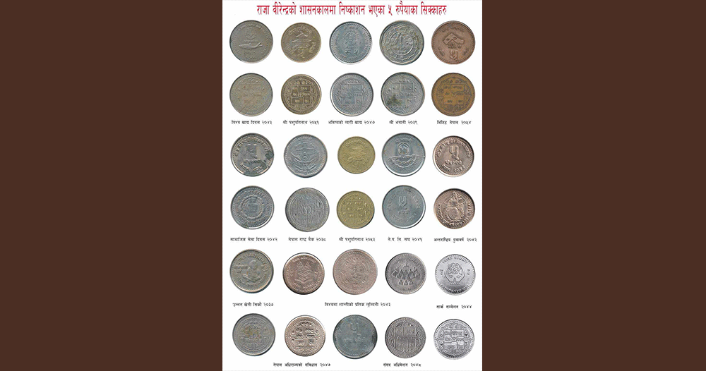यो सम्भवत नेपालमा एउटै शासनकालमा एउटै मुल्यको सबैभन्दा बढी किसिमको सिक्का निष्काशन भएको राजा विरेन्द्रको शासनकालमा रु पाँचको हुनुपर्छ ।