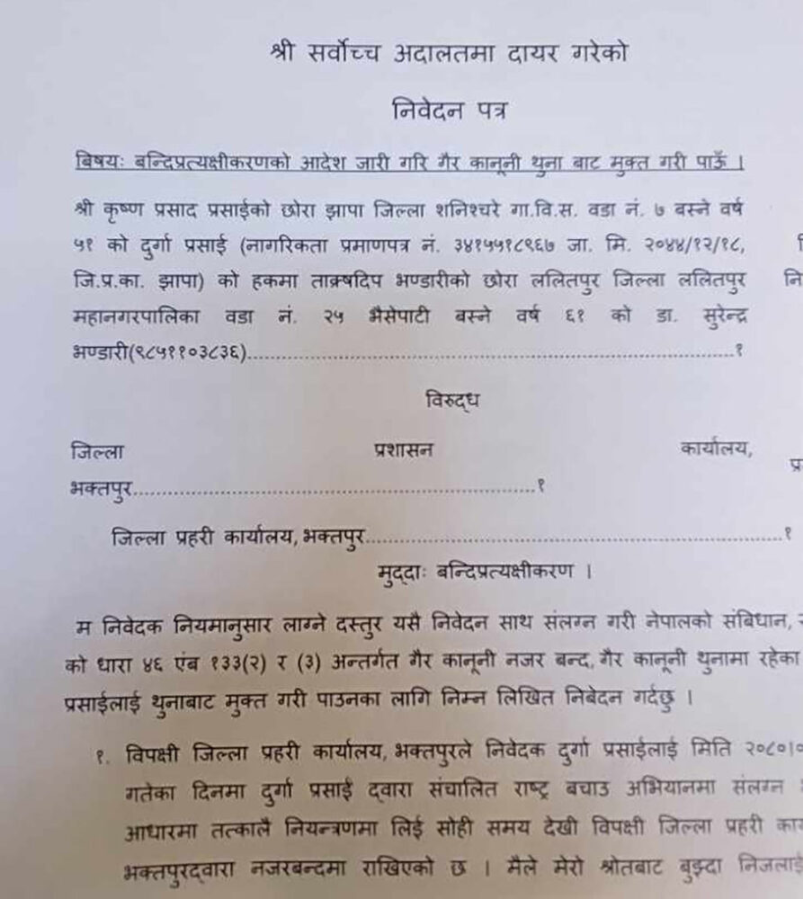 काठमाडाैं । मेडिकल व्यवसायी दुर्गा प्रसाईंलाई कानुनविपरीत घरमा नजरबन्दमा राखिएको भन्दै सर्वोच्च अदालतमा बन्दी प्रत्यक्षीकरणको निवेदन दायर भएको छ।