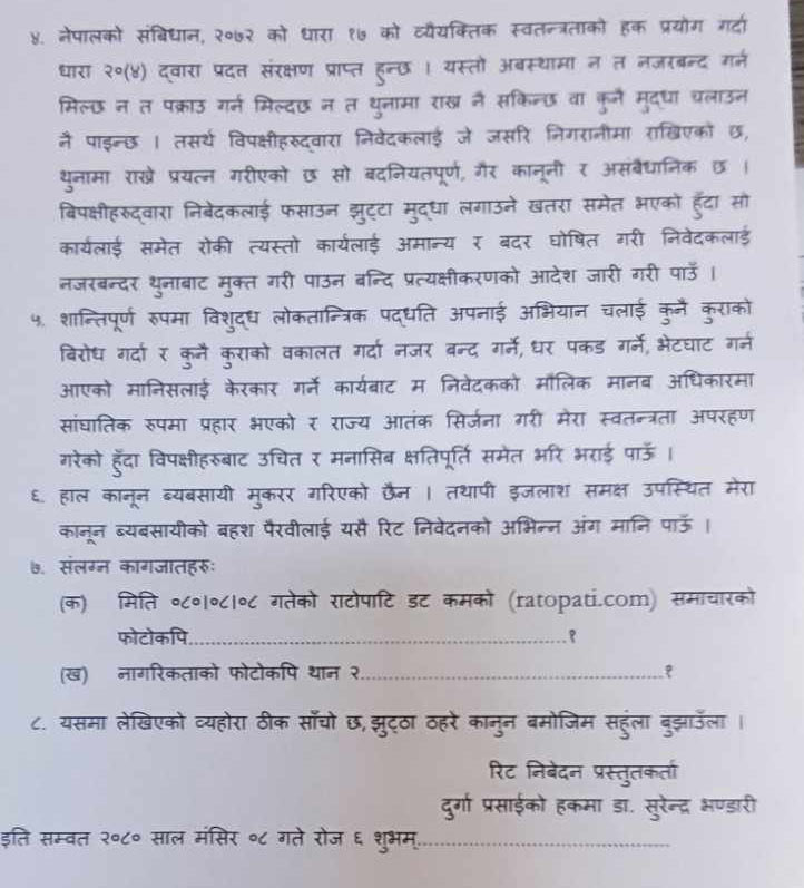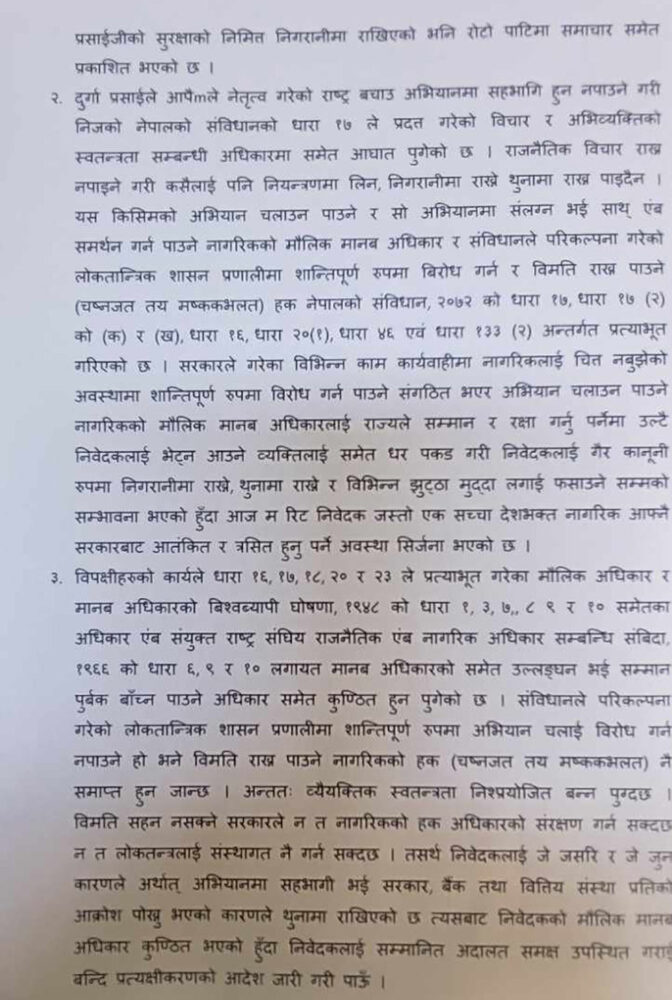 दुर्गा प्रसाईंले नजरबन्दमा राखेको भन्दै गरे बन्दी प्रत्यक्षीकरणको रिट दायर