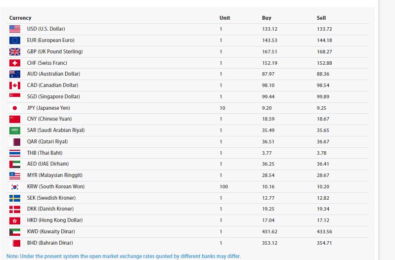 काठमाडौं । नेपाल राष्ट्र बैंकले आज (आइतबार)का लागि विदेशी मुद्राको विनिमयदर तोकेको छ । नेपाल राष्ट्र बैंककाअनुसार विदेशी मुद्राको विनिमयदर अमेरिकी एक डलरको खरिददर १३३ रुपैयाँ १२ पैसा र बिक्रीदर १३३ रुपैयाँ ७२ पैसा रहेको छ ।