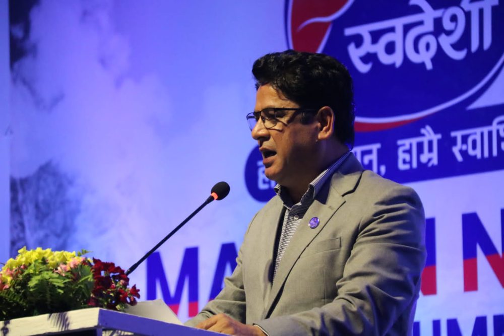 उद्योग मन्त्रालयसँगको साझेदारीमा नेपाल उद्योग परिसङ्घले आज यहाँ आयोजना गरेको ‘मेक इन नेपाल–स्वदेशी’ अभियानको उद्घाटन कार्यक्रममा उनले भने, ‘तुलनात्मक लाभ लिई व्यापार विस्तार गर्न पनि स्वदेशी उद्योगलाई प्रवद्र्धन गर्न आवश्यक छ, यसका लागि आगामी बजेटमा व्यवस्था हुनेछ, उद्योगको प्रवद्र्धन गर्न, स्वदेशी उद्योगलाई उच्च महत्व दिन पनि मन्त्रालय प्रतिबद्ध छ, सोही दिशामा अर्थ मन्त्रालयलाई सुझाव दिइएको छ र आगामी दिनमा पनि दिइनेछ, व्यक्तिगत रुपमा पनि म यस कार्यका लागि विशेष पहल गर्नेछु ।’