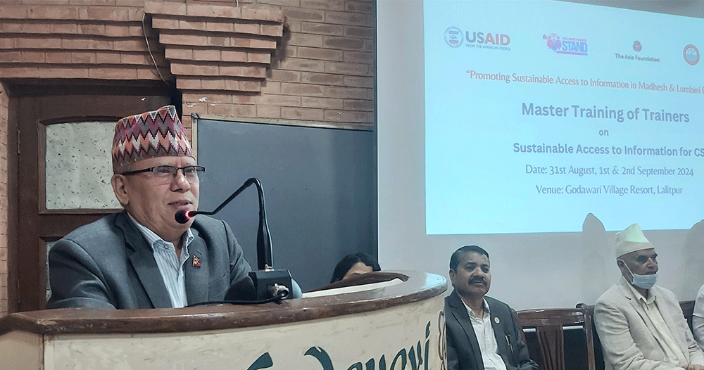 सूचनाको हकका लागि राष्ट्रिय महासङ्घद्वारा आज ललितपुरको गोदावरीमा दिगो सूचना प्रवर्द्धन परियोजनाअन्तर्गत नागरिक समाजका प्रतिनिधिलाई सूचनामा दिगो पहुँचमा पुर्याउन आयोजित प्रशिक्षक प्रशिक्षणको उद्घाटन सत्रमा प्रमुख सूचना आयुक्त डा गुरुङले सूचनाको हक नागरिकको अधिकार भएकाले यसलाई अभियानका रुपमा लगिनुपर्ने बताए ।