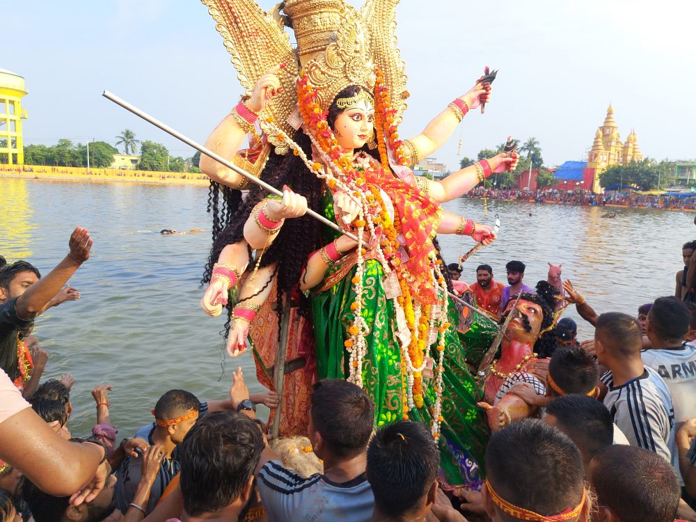 दुर्गा भवानीको प्रतिमाका साथै पूजाका लागि निर्माण गरिएको भगवान शिव, गणेश, कात्तिक, मातालक्ष्मी र माता सरस्वतीको प्रतिमालाई बरुण सरोवरमा सेलाइएको पूजा समितिका अध्यक्ष शिवचन्द्र चौधरीले जानकारी दिए ।