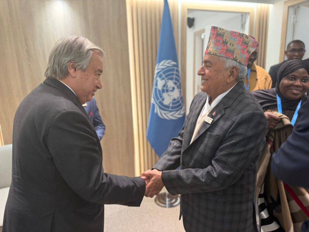 बाकु(अजरबैजान) । राष्ट्रपति रामचन्द्र पौडेलले जलवायु परिवर्तनले पारेका असरमा विकसित देशलाई गम्भीर बनाउन संयुक्त राष्ट्रसघका महासचिव एन्टेरियो गुटेरेसलाई आग्रह गरेका छन् । उनले जलवायु परिवर्तनबाट नेपालले भोग्नुपरेको असरको न्यूनीकरणका लागि विकसित देशहरुबाट अनुदान उपलब्ध गराउन पनि आग्रह गरेका छन् ।
