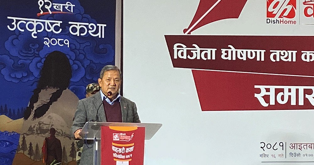 काठमाडौंमा आज आयोजित बाह्रखरी कथा प्रतियोगिताको पुरस्कार वितरण कार्यक्रममा उनले विगतमा देखिएका समस्या र चुनौतीहरूको व्यवस्थापन, राजीतिक परिस्थितिलाई सम्हाल्दै सरकार अगाडि बढिरहेको बताए ।