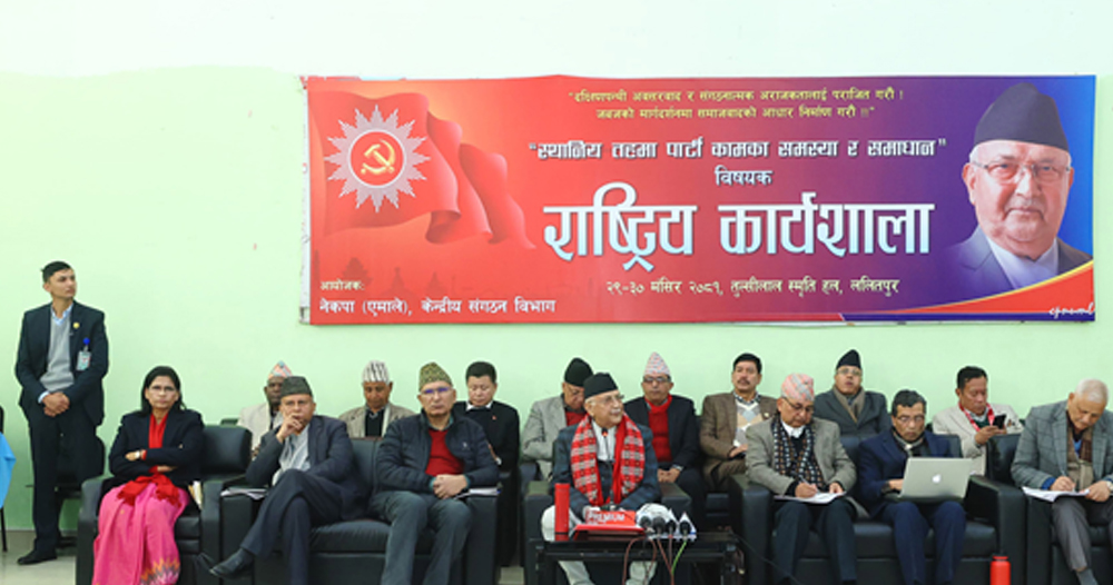 एमाले पार्टीको केन्द्रीय सङ्गठन विभागद्वारा आयोजित ‘स्थानीय तहमा पार्टी कामका समस्या र समाधान’ विषयक दुईदिने राष्ट्रिय कार्यशालालाई आज सम्बोधन गर्दै प्रधानमन्त्री ओलीले देश र जनताका पक्षमा स्थापना भएको पार्टीका नेता तथा कार्यकताका हैसियतले जनताको जीवनस्तर सुधार गर्ने राष्ट्रिय अभियानमा सक्रियताका साथ एकताबद्ध भई लाग्न अनुरोध गर्नुभयो ।