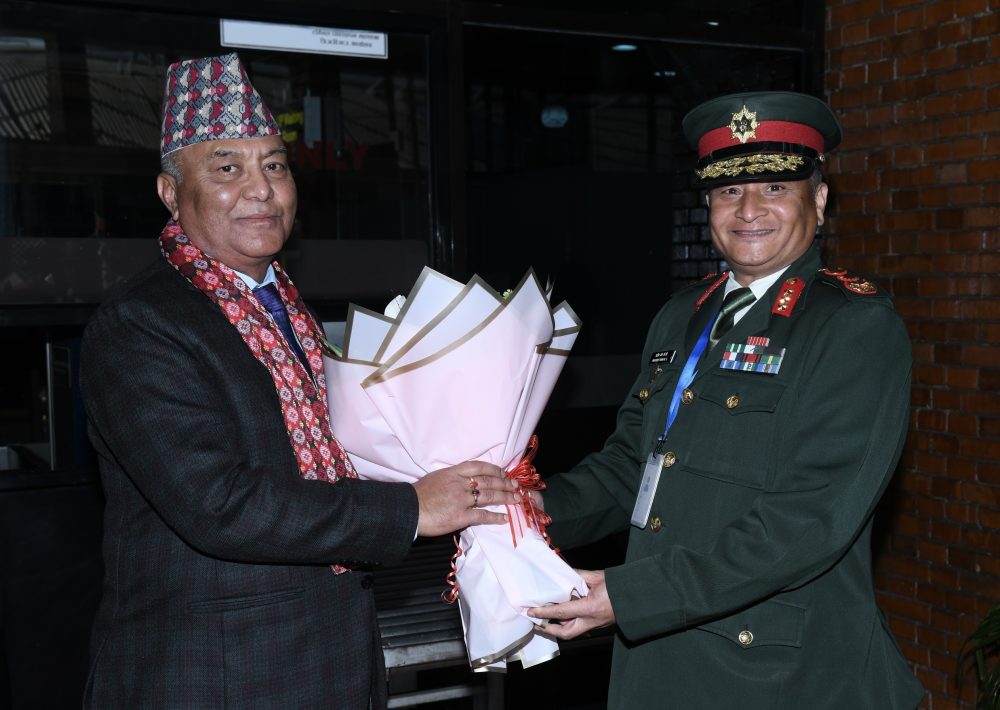 काठमाडौं । प्रधानसेनापति अशोकराज सिग्देल छिमेकी मुलुक भारतको औपचारिक भ्रमण पूरा गरी आज स्वदेश फर्कएका छन् । भारतका स्थलसेनाध्यक्ष जनरल उपेन्द्र द्विवेदीको निमन्त्रणामा छिमेकी मुलुकको भ्रमण सम्पन्न गरी फर्कएका प्रधानसेनापति सिग्देललाई बलाध्यक्ष रथी प्रदीपजङ्ग केसीले त्रिभुवन अन्तर्राष्ट्रिय विमानस्थलमा स्वागत गरे ।