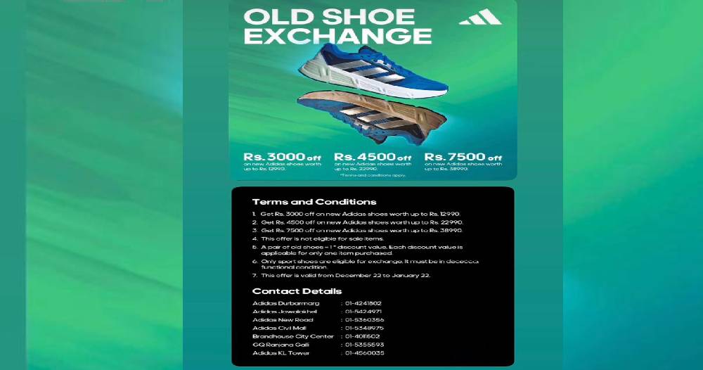 यो योजना अन्तर्गत राजधानीमा रहेको एडिडासको आधिकारिक सो रुममा यो अफर लागू हुने पनि रुट्स फेसन प्रा.लिले जनाएको छ । जुनसुकै ब्राण्डको पुरानो जुत्ता ल्याएर अफरमा सहभागी बन्न पनि कम्पनीले आग्रह गरेको छ । यसरी सङ्कलन भएको पुराना जुत्ता तथा नगद ती तीन वटा सामाजिक संस्थालाई प्रदान गर्ने पनि संस्थाले जनाएको छ । यो योजना डिसेम्बर २५ देखि २०२५ जनवरी २४ सम्म सञ्चालन हुने छ ।