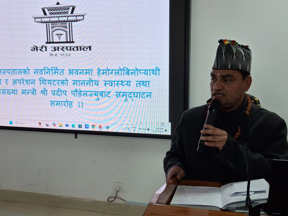 भेरी अस्पताल, नेपालगञ्जमा आज स्थापना गरिएको अत्याधुनिक ‘अपरेसन थिएटर’को उद्घाटन गर्दै मन्त्री पौडेलले सिकलसेल र थालेसेमियाका बिरामीको उपचारमा सरकारले कुनै पनि कमी हुन नदिने प्रतिबद्धता व्यक्त गरे । उनले भने, ‘यसका बिरामीका लागि सात प्रदेशका प्रादेशिक अस्पतालहरूमा छुट्टै वार्डको प्रबन्ध गरिनेछ ।’