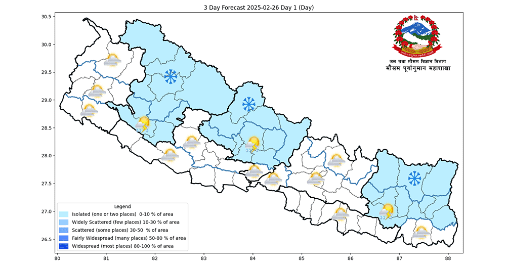 कोशी, गण्डकी र कर्णाली प्रदेशका उच्च पहाडी तथा हिमाली भागका एक–दुई स्थानमा हल्का हिमपातको सम्भावना छ । त्यसैगरी, आज राति देशका पहाडी भागमा आंशिकदेखि साधारणतया बदली रही बाँकी भेगमा मौसम सफा रहनेछ । कोशी, गण्डकी, कर्णाली र सुदूरपश्चिम प्रदेशका उच्च पहाडी तथा हिमाली भागका एक–दुई स्थानमा हल्का हिमपातको सम्भावना छ ।