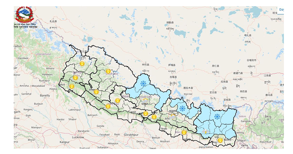 आज दिउँसो कोशी प्रदेशका पहाडी भू–भागमा आंशिकदेखि साधारणतया बदली, बागमती प्रदेश र गण्डकी प्रदेशका पहाडी भू–भागमा आंशिक बदली रही बाँकी भू–भागमा आंशिक बदलीदेखि मौसम मुख्यतया सफा रहनेछ । कोशी प्रदेश, बागमती प्रदेश र गण्डकी प्रदेशका उच्च पहाडी तथा हिमाली भू–भागका एक–दुई स्थानमा हल्का हिमपातको सम्भावना रहेको छ ।