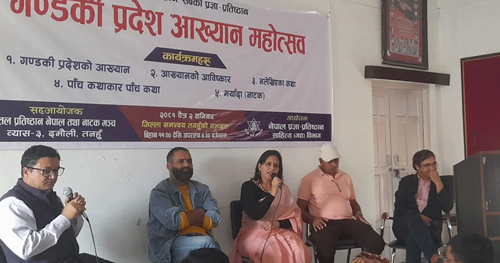 दमौली । नेपाल प्रज्ञा–प्रतिष्ठान साहित्य गद्य विभागको आयोजना र गीतल प्रतिष्ठान तथा नाटकमञ्च तनहुँको सहआयोजनामा शनिबार दमौलीमा गण्डकी प्रदेश आख्यान महोत्सव गरिएको छ ।