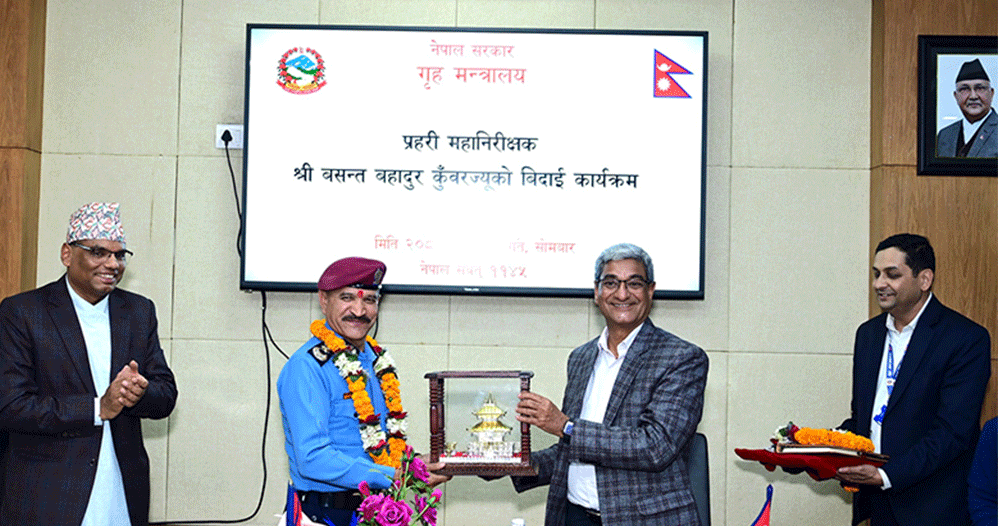 काठमाडौं । गृहमन्त्री रमेश लेखकले सेवा निवृत्त हुन लाग्नुभएका प्रहरी महानिरीक्षक वसन्तबहादुर कुँवरलाई बिदाइ गरेका छन् ।