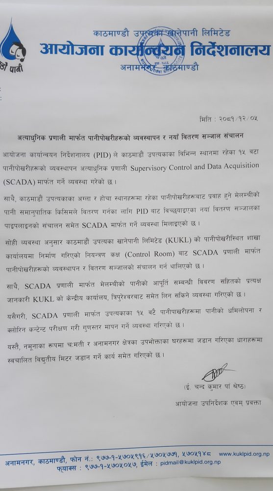 साथै, एससिएडिए प्रणाली मार्फत मेलम्चीको पानीको आपूर्ति सम्बन्धी विवरण सहितको प्रत्यक्ष जानकारी केयुकेलको केन्द्रीय कार्यालय, त्रिपुरेश्वरबाट समेत लिन सकिने व्यवस्था गरिएको छ ।