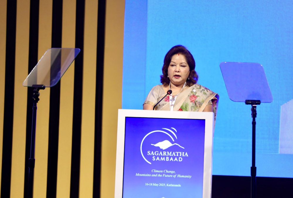 ‘जलवायु परिवर्तन, हिमाल र मानव जातिको भविष्य’ विषयमा पहिलोपटक आज यहाँ आयोजित ‘सगरमाथा संवाद’को उद्घाटन सत्रमा स्वागत मन्तव्य व्यक्त गर्दै उनले हिमाल करोडौँ मानिसको ताजा पानीको स्रोत बनेको बताइन् । हिमालयले आज जलवायु प्रेरित अवरोधको सबैभन्दा ठूलो भार बोकिरहेको बताउँदै उनले हिमनदी जलवायुको असरका कारण पग्लिने क्रम तीव्र रुपमा बढेको उल्लेख गरिन् । यसले गर्दा हिमाली समुदायको दैनिक जीवनमा नकारात्मक प्रभाव परेको उनको भनाइ थियो ।