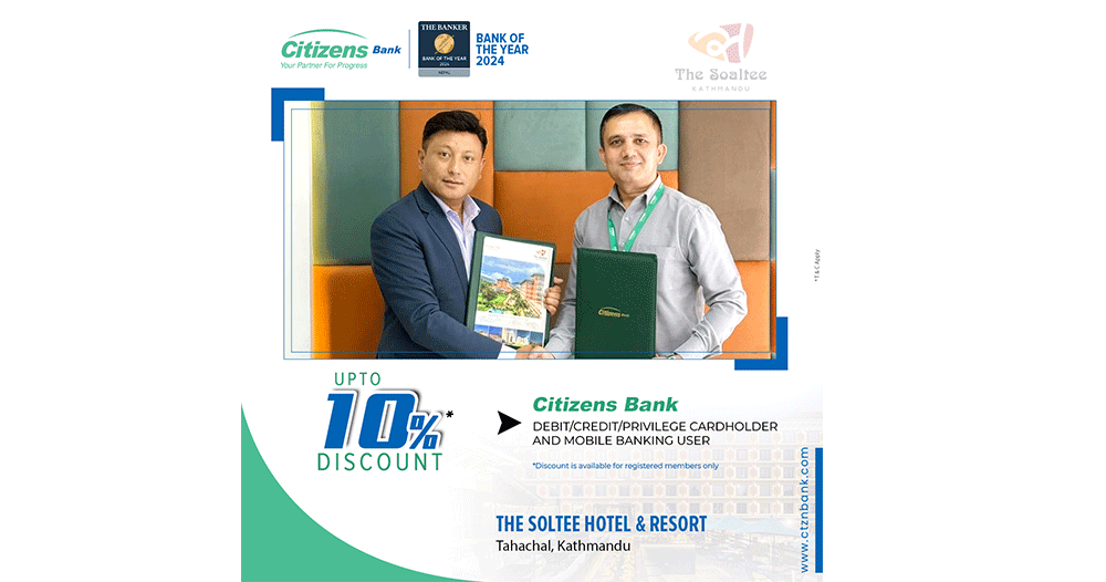 सो समझदारी पत्रमा हस्ताक्षर पश्चात् सिटिजन्स बैंकका कार्डबाहक, प्रिभिलेज कार्ड बाहक र मोबाइल बैंकिङ्ग ग्राहकहरूले द सोल्टी होटल एण्ड रिर्सोटको सम्पूर्ण आउटलेटमा १० प्रतिशत आकर्षक छुट पाउनेछन् ।