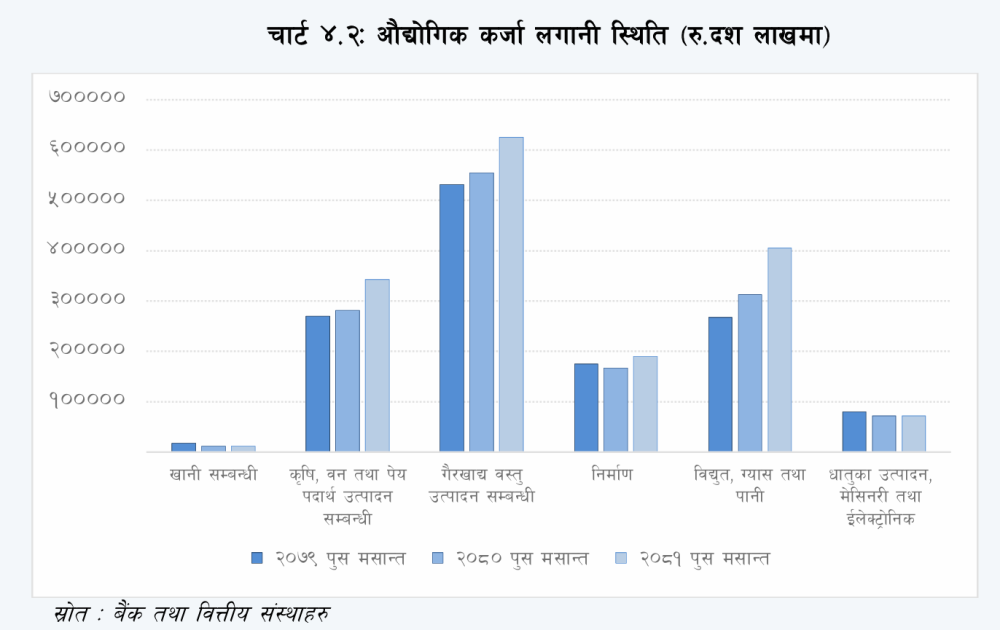 राष्ट्र बैंकका अनुसार क्षेत्रगत औद्योगिक कर्जा पनि २०८० पुस मसान्तको तुलनामा २०८१ पुस मसान्तमा बैंक तथा वित्तीय संस्थाले औद्योेगिक क्षेत्रमा प्र्रवाह गरेको कर्जा १७ दशमलव ६६ प्रतिशतले वृद्धि भई १६ खर्र्ब ४६ अर्ब ७० करोड पुगेको छ । गत वर्षको सोही अवधिमा यस्तो कर्जा चार दशमलव १९ प्रतिशतले बढेको थियो ।