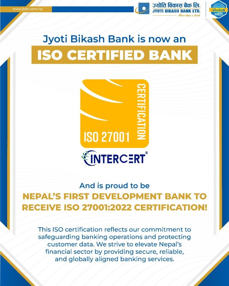 यस सँगै ज्योति विकास बैंकको सूचना सुरक्षा अन्तर्राष्ट्रिय स्तरको रहेको सर्टिफाइ भएको छ । साथै, आईएसओ २७००१ः२०२२ सर्टिफिकेशनले बैंकप्रति ग्राहकवर्ग थप विश्वस्त हुने आधार निर्माण गरेको छ ।