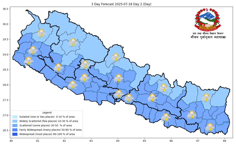 कोशी, वाग्मती, गण्डकी र कर्णाली प्रदेशका एकदुई स्थानमा भारी वर्षाको सम्भावना छ । देशका उच्च पहाडी तथा हिमाली भू-भागका केही स्थानमा हल्कादेखि मध्यम वर्षा र हिमपातको सम्भावना छ । साथै लुम्बिनी र सुदूरपश्चिम प्रदेशका तराई भेगका केही स्थानमा हुरीको सम्भावना छ ।