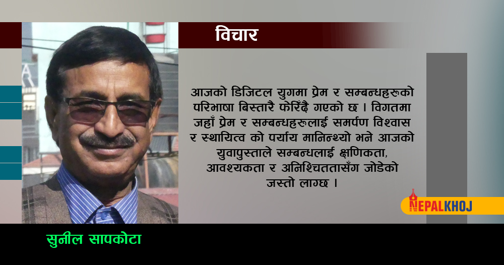 आजको डिजिटल युगमा प्रेम र सम्बन्धहरूको परिभाषा बिस्तारै फेरिँदै गएको छ। विगतमा जहाँ प्रेम र सम्बन्धहरूलाई समर्पण विश्वास र स्थायित्व को पर्याय मानिन्थ्यो भने आजको युवापुस्ताले सम्बन्धलाई क्षणिकता, आवश्यकता र अनिश्चिततासँग जोडेको जस्तो लाग्छ । आज ” I love you ” भन्दा पहिले ” Are we even dating ?” भन्ने प्रश्न उठेको देखिन्छ। आजका आधुनिक सम्बन्धहरू नयाँ- नयाँ नाममा परिभाषित भएको देखिन्छ।