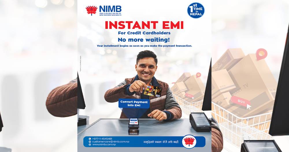 अबदेखि एनआईएमबी क्रेडिट कार्ड प्रयोगकर्ताहरूले कुनै पनि व्यापारिक स्थानमा ‘एनआईएमबी पीओएस मशिन’मार्फत भुक्तानी गर्दा सोही क्षणदेखि किस्ताबन्दी (ईएमआई) सुविधा प्रयोग गर्न सक्नेछन् ।