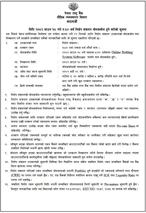 राष्ट्र बैंकका अनुसार आज अपराह्न तीन बजेसम्ममा अनलाइन बिडिङ सिस्टम सफ्टवेयर मार्फत उक्त परिमाणमा रकम तानिएको हो । परिपक्व हुने अवधि ४२ दिन तोकिएको यो उपकरणको सावाँ व्याज भुक्तानी मिति भदौ २९ गते तोकिएको छ । राष्ट्र बैंकका अनुसार वाणिज्य बैंक, विकास बैंक र फाइनान्स कम्पनीहरूको लागि यो उपकरण बिक्री गरिएको हो ।