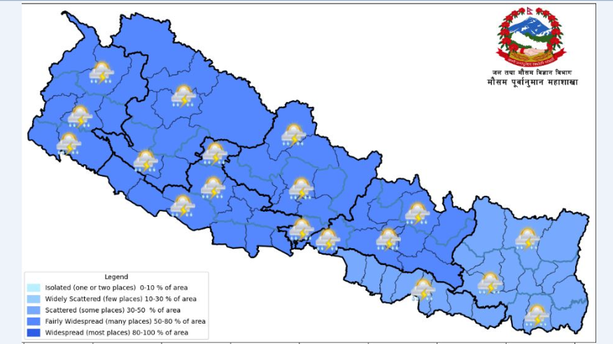 जल तथा मौसम विज्ञान विभाग मौसम पूर्वानुमान महाशाखाका मौसमविद् हरिप्रसाद दाहालका अनुसार आज दिउँसो र राति पश्चिम नेपालमा बढी वर्षा हुने जानकारी दिनुभयो । यद्यपि अन्य प्रदेशका एकदुई स्थानमा पनि भारी वर्षा हुनसक्ने अनुमान गरिएको छ ।