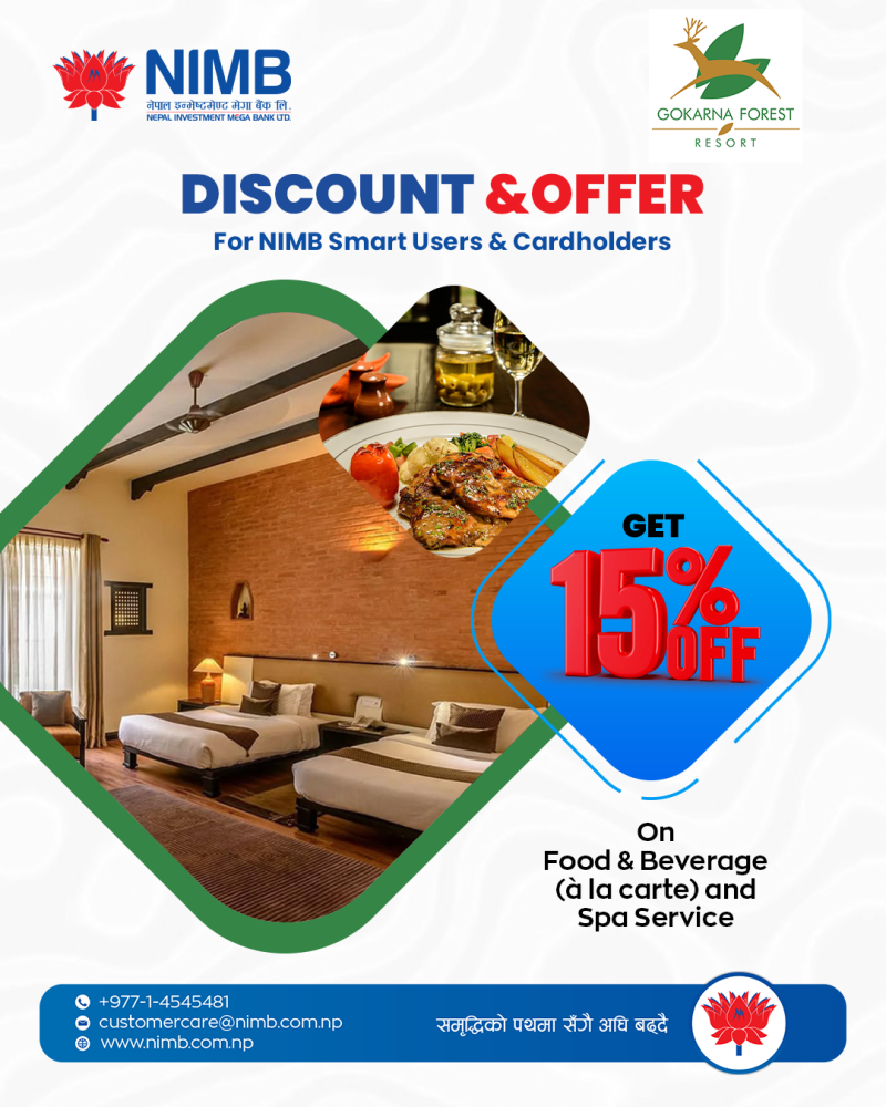 सम्झौता अनुसार बैंकका डेबिट/क्रेडिट कार्ड वा एनआईएमबी स्मार्ट एप (मोबाईल बैंकिङ) प्रयोगकर्ताले गोकर्ण फरेष्ट रिसोटमा उपलब्ध फुड एण्ड बेवरेज र स्पा सर्भिस मा १५% छुट प्राप्त गर्न सक्ने छन् ।