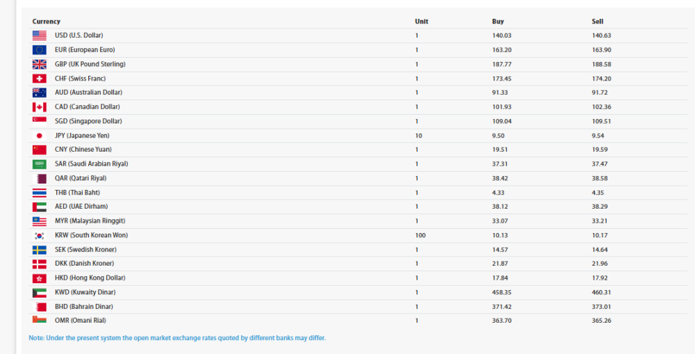 काठमाडौं । नेपाल राष्ट्र बैंकले आजका लागि विदेशी मुद्राको विनिमयदर निर्धारण गरेको छ । राष्ट्र बैंकका अनुसार अमेरिकी डलर एकको खरिदर १४० रुपैयाँ ०३ पैसा र बिक्रीदर १४० रुपैयाँ ६३ पैसा कायम भएको छ ।