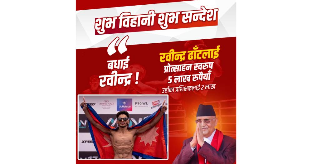 काठमाडौं । आफ्ना भारतीय प्रतिद्वन्द्वीलाई हराउँदै म्याट्रिक्स फाइट नाइट (एमएफएन) बान्टमवेट च्याम्पियन बन्न सफल बझाङका रवीन्द्र ढाँटलाई प्रोत्साहनस्वरुप रु पाँच लाख प्रदान गरिने भएको छ ।