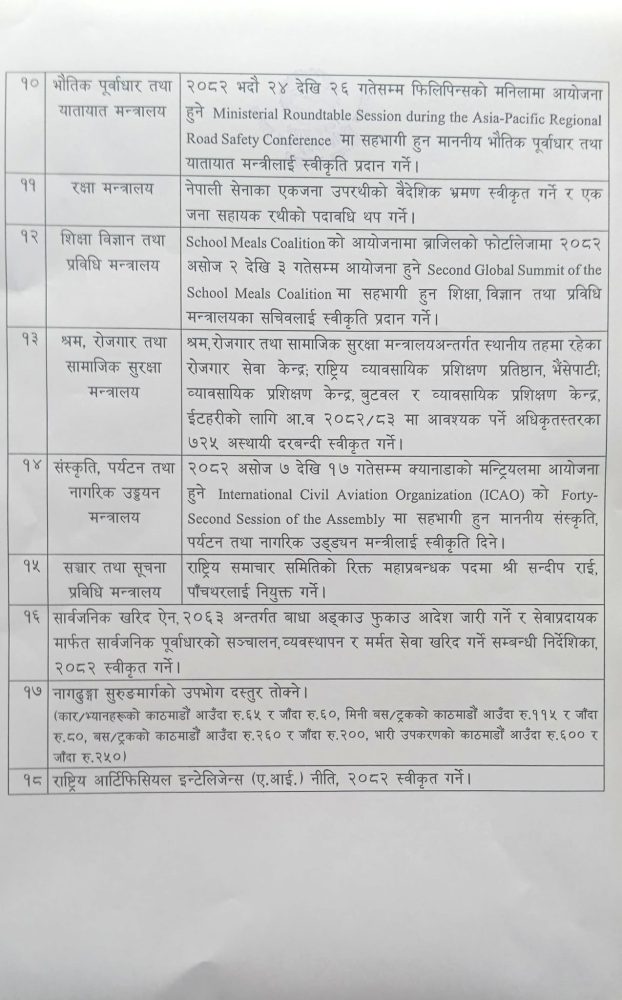 यस्तै बैठकले नागढुंगा सुरुङमार्गको उपभोग दस्तुर तोक्ने, सार्वजनिक खरिद ऐन, २०६३ अन्तरगत बाधा अड्काउ फुकाऊ आदेश जारी गर्ने, राससको महाप्रबन्धकमा सन्दीप राईलाई नियुक्त गर्नेसहितका १८ वटा निर्णय गरेकाे छ ।